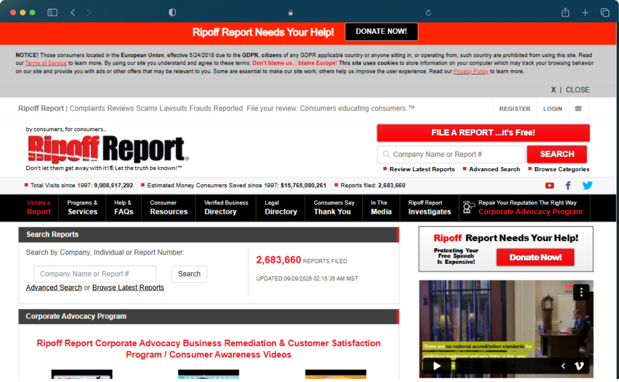 RipoffReport.com is one of the oldest and most notorious consumer complaint websites on the internet. Founded in 1998, the site allows anyone to post allegations, reviews, or grievances about a company, professional, or individual — often without fact-checking or moderation. The site positions itself as a “consumer advocacy platform,” but over time, it has gained a reputation as a digital dumping ground for highly damaging and frequently one-sided accusations.
